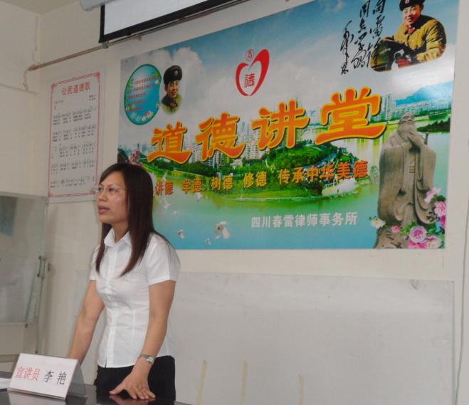 春雷律师事务所为了全面贯彻,深入学习党的十八大精神。以及中央、省、市、区文明委(办)提出的2013年深入开展文明单位创建活动指示精神,建立规范的道德讲堂,常规化开展道德讲堂的要求,在五一前夕举行了道德讲堂开讲。题目是:《道德讲堂之将“孝”表达出来》。 所副主任李青松在主持活动时说:“尊老爱幼是我们中华民族的传统美德,是先辈们传承下来的宝贵财富,重视人伦道德,敬老、尊老是我们文化传统中的精华,也是中华民族强大的凝聚力和亲和力的具体体现。在春夏之际,在举国上下迎接五一劳动节之际,我们举行道德讲堂开讲。” 在中国老百姓、炎黄好儿孙重情重义重品行,立志先立人的《公民道德歌》的歌声中开始。首先,看了全国道德模范“郭明义”先进事迹的视频;李磊律师领读了《孟子》“老吾老,以及人之老;幼吾幼,以及人之幼”,这段话的意思是:“尊敬自己的父母和老人,推广开来也是尊敬别人的父母和老人;爱护自己的幼小儿女,推广开来也是爱护别人的幼小儿女”。 宣讲员李艳律师宣讲《道德讲堂之将“孝”表达出来》: 4.20雅安卢山地震过去了,但地震却再次让大家感受到让生命的脆弱,与此同时,大家都伸出了援助之手,在生命中人性善良的一面再次给予了诠释。常言道:“百善孝为先”, 从字面涵义看,它反映了我们中华民族对“孝”的重视度,孝乃子女对父母、晚辈对长辈的尊敬、依从、感恩的心理。一个善良的人,首先应当是一个孝顺的人,因为他懂得“身体发肤受之父母”的根本。在我们现实生活中,当一颗颗生命降临、牙牙学语、蹒跚学步、穿衣吃饭、逐渐长大,这些成长经历无不让我们每个人都想起自己的童年,也让孩子更加直接深切地感受到父母的爱。但随着孩子长大工作,与父母相处的时间却越来越少,尽孝也仅成为我们一部份人脑子里的一种想法而已!所以99年春晚,陈虹、蔡国庆等人演唱的《常回家看看》这首歌曲因为它真切地反映了当代人内心深处的渴求而一夜响遍大江南北。 今天我向大家讲述一个关于孝的故事,故事主人公叫钟小兰——我的嫂子。 1997年,我哥经人介绍与嫂子恋爱,后奉子成婚,嫂子成为了我们家庭中的一员。哥嫂刚结婚那几年,因为生活习惯等多种原因,嫂子经常与母亲发生争执,严重的时侯也有恶言相向,让婆媳关系一度紧张,也印证了那句“婆媳关系难处”的老话。后来哥嫂外出打工几年,期间也吃了不少苦,回家后,婆媳关系有所缓和,再后来在亲友的帮助下,双方相处还算溶恰,整个家庭生活也算是平静自在。在2011年6月19日星期天下午,我接到嫂子的电话说:妈刚才从医院检查出来,医生给我说是肺癌,还是晚期,我和医生都没给妈说是啥病,我一时不知道该咋办,所以先给你打电话说一下;医生建议再到其他医院复查一下再作治疗。后来嫂子将母亲接回家中,并与哥和父亲一起商量好后把家里事情安排妥当于第二天一起将母亲送到绵阳市中心医院进行复查,希望之前的诊断是误诊,但事与愿违反,这次医生诊断仍是肺癌、晚期、骨转移,无法手术,并告知:按照临床案例,病人最多能活6个月了。听到最终这个确认信息后,家里所有人的心情都非常沉重。复诊结束后,我们所有的家庭成员(除母亲外)一起商量了一下,最后决定:1、不将实情告知母亲,让母亲平静地走完她人生最后的路程;2、周一至周五由嫂子在家照顾母亲,周六与周日由我回家照顾;就这样,周一至周五嫂子按照医嘱照顾母亲,除正常外出访医求约外,就经常在母亲体能允许的前提下带母亲到外面散步、串门、与邻居说说话;因为母亲患的是肺上的疾病,自然无法到厨房做饭菜,所以,所有的家务活基本上由嫂子一人承担了,周六周日再由我换班照顾母亲,就这样在坚持了三个月后,母亲最终因为病情恶化而卧床不起,并伴大小便失禁!当时家里就商量送母亲住院治疗,由护士护理,但母亲坚绝不同意去医院,去了医院之后就闹着回家,无奈,只能继续在家里对母亲进行治疗与护理。由于母亲爱干净,为照好顾母亲,嫂子就为母亲准备了许多日常护理用品,如尿不湿、棉垫子、布片等。照顾一段时间后,嫂子发现尿不湿之类的用品透气性差,除了可以减少护理的工作量外,这类用品本身对母亲的身体并无任何益处,所以之后就全部改用棉垫子与布片,并按照医生的要求对母亲进行特殊护理。这样一来,嫂子在周一至周五的工作量就直线大增,每天除了为母亲多次准备少量的食物给母亲喂食外,每隔一两小时还为母亲翻一次身,与母亲说说话,若遇母亲大小便则替母亲整理,所以基本上随时准备为母亲清洁身体,稍后再将换下的物品洗净备用,这样的日子一直持续到母亲离开人世的那一天,那一天也刚好是医生所预计的母亲生命的终点。期间,嫂子也病过两次,但一直坚持很好地照顾母亲,而其他家庭成员却从未听到过嫂子的任何报怨。 大家都听说过“久病床前无孝子”这句老话,但刚才我讲的这个我亲身经历和感受的故事说明老话也还是有例外的,因为在我看来,嫂子已经对婆婆尽到了应尽的孝道。 有人这样测算:假如你父母60岁,中国人均寿命72岁。如果你父母能活到80岁,你还能陪他们20年。如果你每年回家一次,每次陪父母6天,每天陪父母11小时,每年你能陪他们66小时。20年×66小时/年=1320小时,1320小时/24小时/天=55天。所以这么一测算,我们能看到我们与父