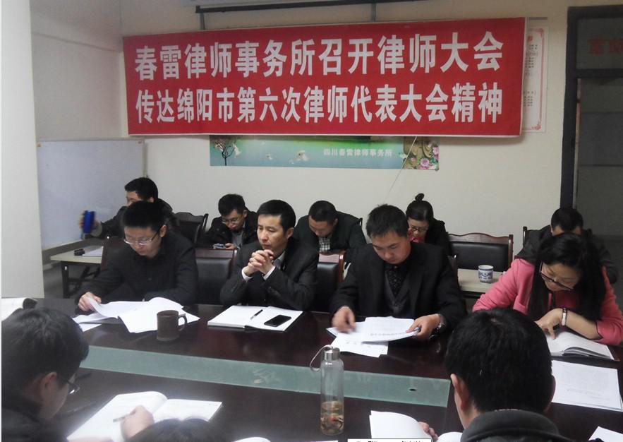 2014年3月19日下午,春雷律师事务所召开律师会,传达学习市第六次律师代表大会精神。吕安全主持会议并传达了会议议程和姚 李艳全文传达了市委常委政法书记陈兴春在律代会上的重要讲话,黄法森全文传达了市司法局党委书记刘伟局长在律代会上的重要讲话,吕安全传达了省厅陈副厅长的讲话精神,以及获奖的先进集体、先进个人名字和先进事迹后,律师们进行了认真的讨论发言。律师们认为市律代会的召开是全体律师生活中的一件大事,大会的召开和取得圆满成功体现了党对律师工作的绝对领导,体现了民主集中制的原则,反映了全是律师的心声和愿望,展现了绵阳律师的风采和精诚团结奋进的精神面貌,是一届继往开来的盛会,为今后四年律师工作的走向奠定了坚实的基础。