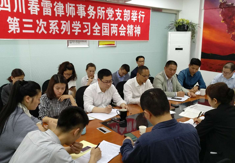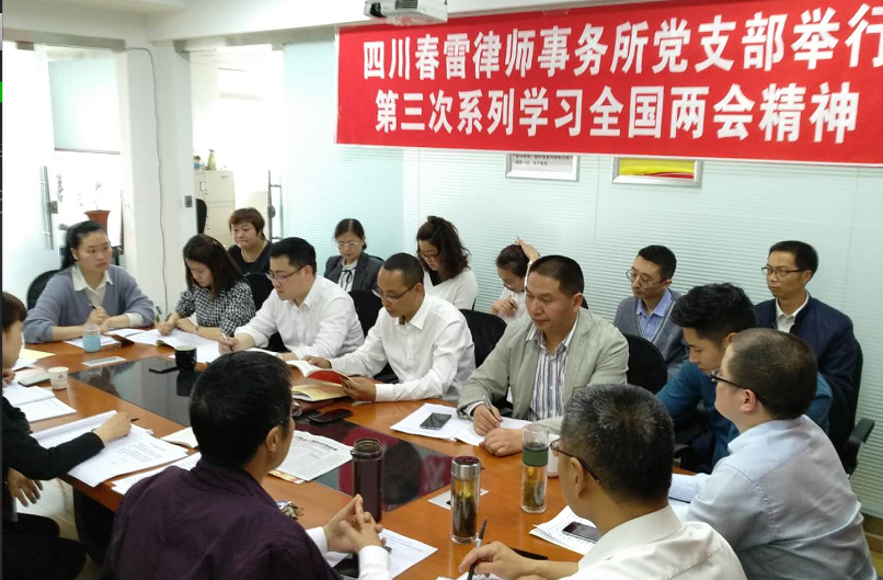 2018年4月11日,四川春雷律师事务所党支部举行全国“两会”精神第三次系列学习会,组织全体党员律师和工作人员对宪法进行再学习。 党支部书记顾仕义同志主持会议并组织到会同志依据《宪法宣誓本》重点学习此次宪法修改的内容:在逐条学习原文的基础上,对照《中国共产党中央委员会关于修改宪法部分内容的建议》、人民日报关于此次宪法修改的社论为指导对重点内容进行了解读和辅导,使大家对这次宪法修改的内容进一步熟悉,对修改宪法的总体要求、意义进一步加深了理解。