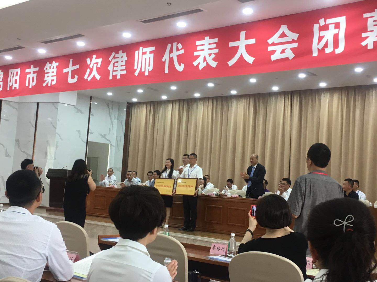 同时,大会主席团在闭幕大会上宣读了有关表彰决定并进行了颁奖仪式,我所李涛副主任上台领取了由四川省司法厅和四川省律师协会共同颁发给我所的“四川省优秀律师事务所”奖牌;汪飞律师被评为“绵阳市优秀律师”并上台领取了奖牌和证书。四川省律师协会程守太会长和中共绵阳市委政法委书记夏凤俭书记作了重要讲话,对绵阳律师行业的发展和律师行业党组织建设、律师事务所的规范化建设、军民融合发展、知识产权保护、律师行业领军人才的培养等方面提出宝贵的意见和建议,对绵阳律师行业的发展起到积极的促进作用。