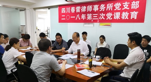 四川春雷律师事务所党支部 举行2018年度第三次党课教育 6月7日下午,春雷所进行年度第三次党课教育。主持人在组织到会党员律师学习习近平总书记在社会马克思诞辰200周年大会上重要讲话后,重点讲了四个问题,共产党宣言的历史地位;马克思主义深刻改变了中国;牢记中国共产党的神圣职责;习近平新时代思想是当代中国马克思主义。在四个问题讲解后,党员律师进行了认真讨论。