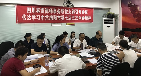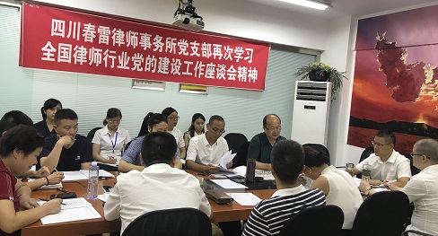 认真学习会议精神 深入研究贯彻措施 ——四川春雷律师事务所党支部召开会议再次学习全国律师行业党的建设工作座谈会精神 为贯彻落实好全国律师行业党的建设工作座谈会精神,四川春雷律师事务所于2018年7月25日,召开全所在位律师和行政人员政治学习会,重点对全国律师行业党的建设工作座谈会上司法部傅政华部长、中央组织部齐玉副部长讲话精神进行了全面学习,并研究部署了进一步加强律所党建工作的方法措施,会议由吕安全律师主持。