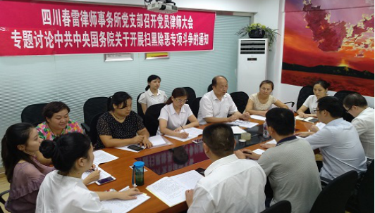 深化认识聚焦执业—四川春雷所召开党员律师大会专题讨论中共中央国务院《关于开展扫黑除恶专项斗争的通知》 四川春雷律师事务所近日召开党员律师大会,对如何贯彻落实中共中央国务院《关于开展扫黑除恶专项斗争的通知》(以下简称《通知》)进行专题讨论。讨论会由吕安全律师主持,全所除开庭、出差人员外共16人参会。 讨论中大家一致认为:中共中央国务院部署的这次“扫黑除恶”专项斗争是在面临打击黑恶势力活动中出现的新情况、新问题而总结出的新提法,从以往的“打”黑到这次的“扫”黑,虽然仅有一字之差,但可以反映出我们党和政府对于铲除黑恶势力、维护社会正常秩序的坚定决心。 讨论会上,大家就律师群体如何积极参与此次扫黑除恶专项斗争进行了踊跃发言,最后在以下五个方面开形成了共识。