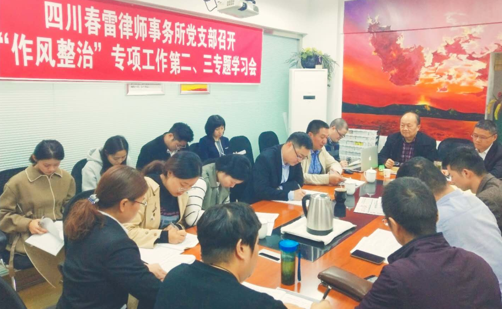 真学习 高站位 把规矩意识挺在作风建设前面 ——四川春雷律师事务所党支部召开“作风整治”专项工作 第二、三专题学习会 2018年10月17日下午,根据《“作风整治”专项行动方案》安排,四川春雷律师事务所举行专题学习会,对“作风整治”重点学习内容进行集中学习和讨论交流。会议由张道远律师主持,全所除开庭、出差人员外共18人参会。 作风整治效果如何,学习教育是基础。在本次作风整治中,春雷所根据本所工作实际,对全所学习内容、时间和方式进行了细致安排,采取切实有力措施狠抓学习教育。一及时归纳作风整治学习内容,编印学习要点下发大家,供大家自学;二是将《党章》、《关于新形势下党内政治生活的若干准则》、《中国共产党问责条例》等重点内容进行梳理,组织全所党员、律师进行集中学习,确保重点内容、人员、时间和效果“四落实”。