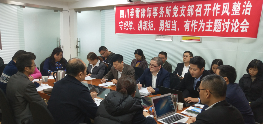 做守纪律、讲规矩的法律人 在治涪兴绵中勇担当、有作为 ——四川春雷律师事务所党支部召开“守纪律、讲规矩、勇担当、有作为”专题讨论会 2018年10月24日下午,根据《“作风整治”专项行动方案》安排,四川春雷律师事务所党支部召开专题会议,组织全所党员、律师开展“守纪律、讲规矩、勇担当、有作为”大讨论活动。专题讨论会由党支部纪检委员汪飞律师组织,全所党员、律师和工作人员共21人参会,分别进行了发言。