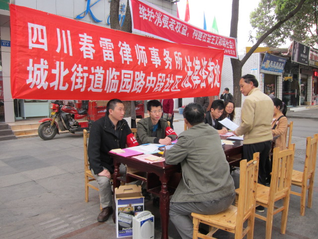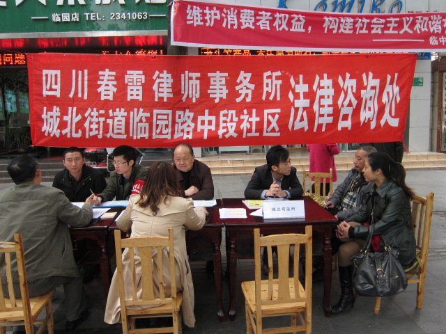四川春雷律师事务所在2013年3月15日派出了律师李磊、李雨嘉、田明聪参加了绵阳市在南河体育中心举行的维护消费者权益的大型宣传活动。为了与社区互动,还派出了律师汪飞、吕安全、敬曦到涪城区城北街道办事处与临园路中段社区联合开展了法制宣传、咨询、维护消费者权益的活动,活动从上午9点到12点。