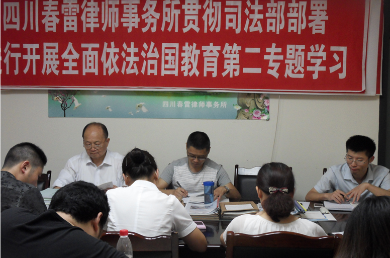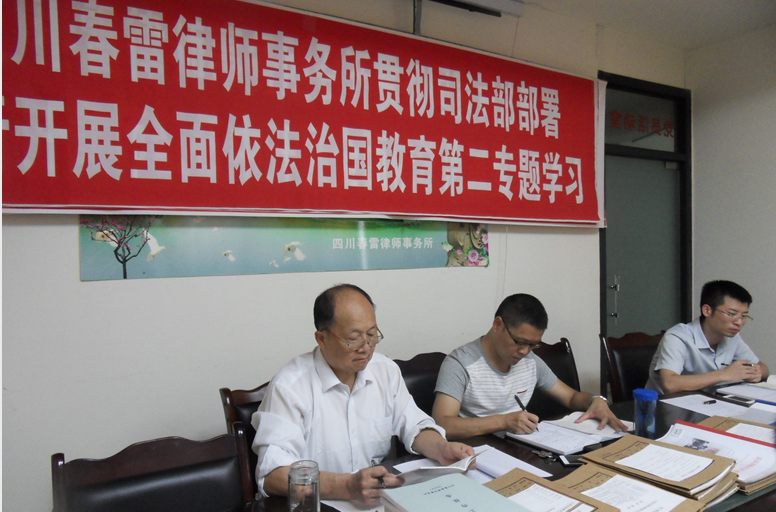 为了认真贯彻司法部关于在律师队伍开展全面依法治国教育的部署,2015年7月15日下午,春雷律师事务所举行依法治国教育第二专题学习会。学习会由教育领导小组成员分别主持,汪飞主持学习党的十八届四中全会公报;李艳主持学习李建国“全面依法治国总目标”的文章;谢辉主持学习栗战书“坚持中国特色社会主义法治道路”的文章;李涛主持学习人民日报社论“实现依法治国的历史跨越”;吕安全主持学习北京青年报“北京锋锐律师事务所被查揭开‘维权’黑幕”的报道的相关内容。