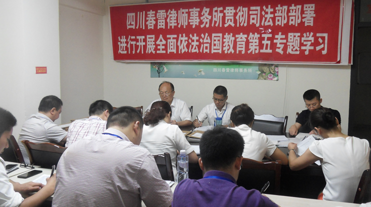 认真学习习近平总书记系列讲话 2015年8月12日下午,春雷律所进行开展全面依法治国教育第五专题学习会,重点学习了习近平总书记五个重要讲话。李涛组织学习了习总书记“毫不动摇坚持和发展中国特色社会主义”;谢辉组织学习习总书记“改革开放只有进行时没有完成时”;毕莉组织学习习总书记“促进社会公平正义,保障人民安居乐业”;汪飞组织学习习总书记“共同推进法治国家、法治政府、法治社会一体建设”;李艳组织学习习总书记在首都各界纪念宪法颁布实施30周年的讲话。在学习习总书记五次重要讲话的原文时,五位组织人分别对五个讲话的重要性进行了辅导和深层次的解读。