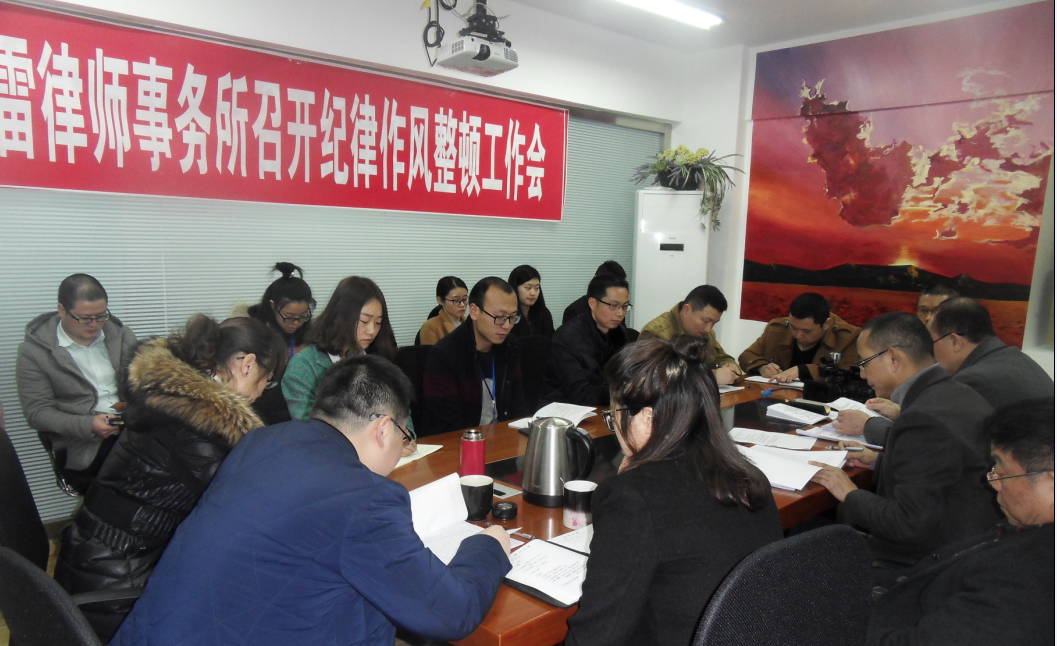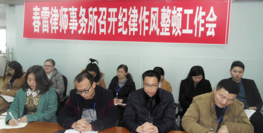 四川春雷律师事务所召开 纪律作风集中教育整顿工作会 为了认真贯彻市区政法委和市区司法局,市律师协会单位关于在律师队伍中开展纪律作风集中教育整顿工作的文件精神。春雷律师事务所于3月16日召开律师大会,党支部书记顾仕义全文传达了上级文件和要求。支部委员杜伟从四个方面进行了安排。