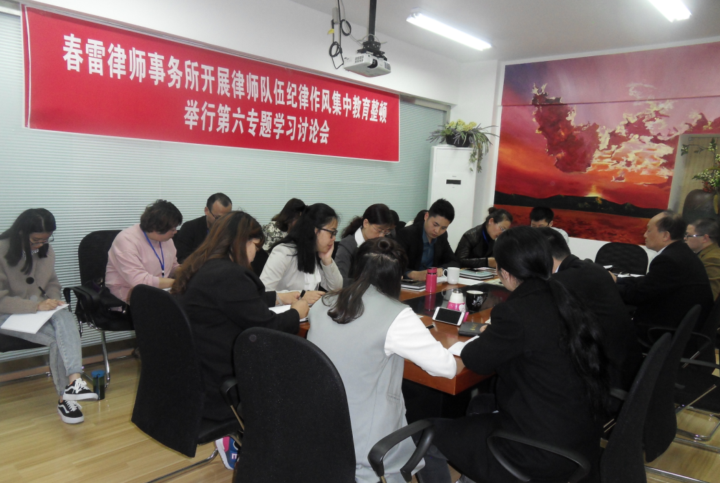 为进一步提高全体律师对律师队伍纪律作风集中教育整顿的思想认识,春雷所在2017年4月12日举行第六专题学习,助推两学一做学习教育的常态化和制度化,支部学习宣传委员李艳同志组织到会律师学习了 党员律师在发言中认为:“推进两学一做学习教育常态化和制度化,是坚持思想建党,组织建党,制度治党紧密结合的有力抓手,是全面从严治党的基础性工程,我们要充分认识推进两学一做学习教育的重大意义,坚持用党章党规规范我们党员律师的行为。用习近平总书记系列重要讲话精神武装头脑,指导我们的工作,不断增强政治意识,大局意识,核心意识,看齐意识,做到政治合格,执行纪律合格,道德品行合格,发挥作用给力,认真履行党员义务,践行宗旨不忘初心。”