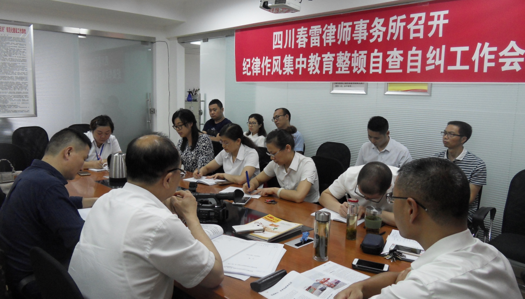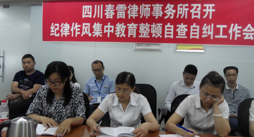 四川春雷律师事务所召开 纪律作风集中教育整顿自查自纠工作会 继召开纪律作风集中教育整顿查摆问题、整改查处、制定整改措施动员会后,在个人进行自查自纠报告的基础上,于2017年5月31日下午召开纪律作风集中教育整顿自查自纠工作会,会议由支部委员吕安全主持,要求到会人员要进一步提高对自查自纠和整改措施的认识,自查自纠中要联系思想实际,找准问题,亮出改的措施,通过查、找、改、行四个方面,进一步增强守纪守规的自觉性,提高政治站位,增强“四个意识”做到“三个”拥护,加深对核心意识的认同和理解,在法律服务工作中做到政治过硬、纪律过硬、作风过硬、责任担当过硬、业务过硬、思想道德品行过硬、诚信意识过硬、信仰意识过硬、看齐意识过硬,全面推进两学一做学习教育常态化、制度化,促进党支部规范建设和律所规范建设不断深入。