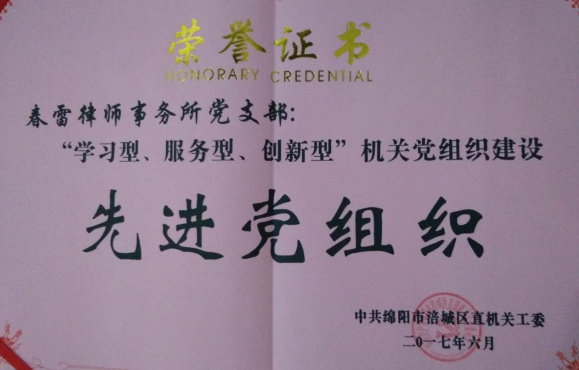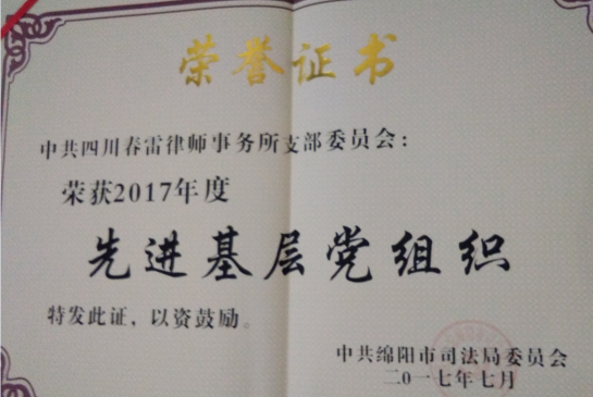 经春雷所全体党员、律师及工作人员的辛勤耕耘,春雷律师事务所及律师个人再创佳绩。 在庆祝建党96周年活动中,中共绵阳市司法局委员会在全市律师事务所中唯一授予春雷律师事务所党支部“先进基层党组织”荣誉称号; 在庆祝建党96周年活动中,中共绵阳市涪城区直机关工委在全区两新组织律师事务所行业中唯一授予春雷律师事务所党支部“‘学习型、服务型、创新性’机关党组织建设先进党组织”荣誉称号; 在庆祝建党96周年活动中,涪城区司法局党委授予春雷律师事务所“先进基层党组织”荣誉称号; 在庆祝建党96周年活动中,中共绵阳市司法局委员会表彰吕安全同志为“优秀共产党员”、中共绵阳市涪城区司法局表彰杜伟和蒋琼华同志为“优秀共产党员”。 在庆祝建党96周年为契机,春雷所全体员工将在今后的工作中不忘初心继续前行,为绵阳涪城法治建设再做贡献。