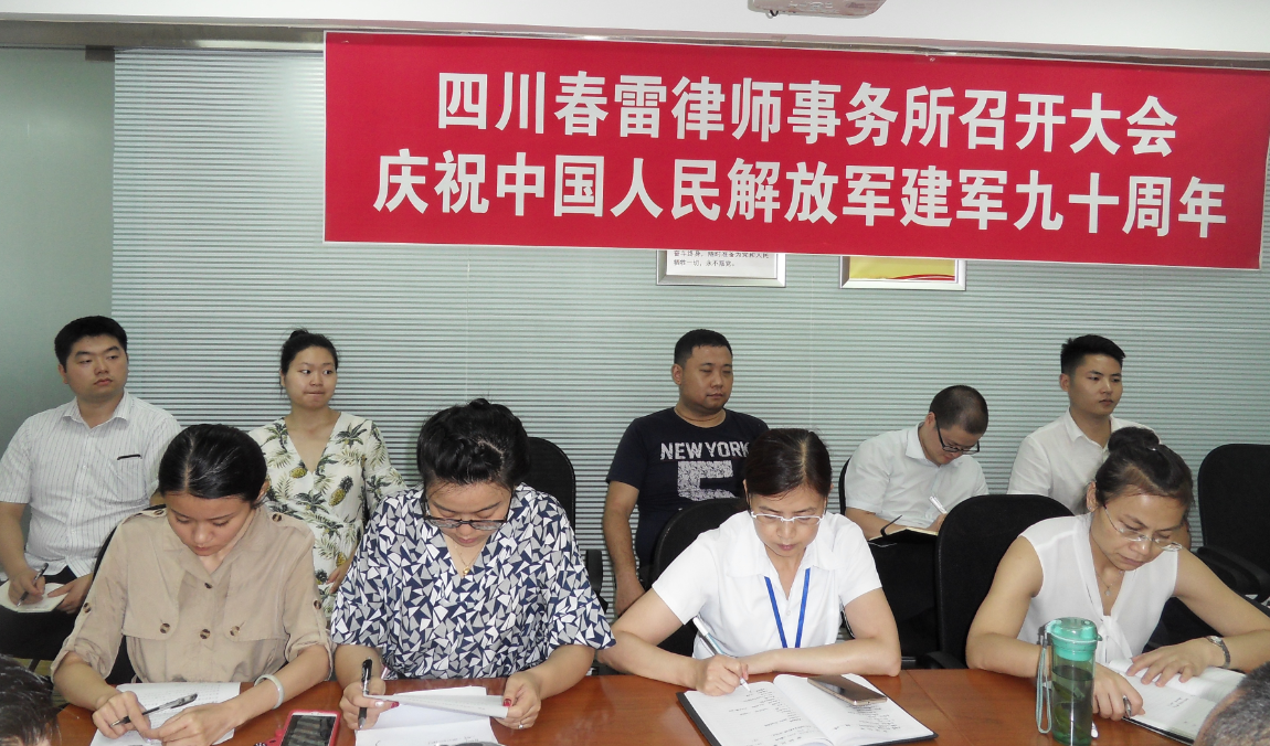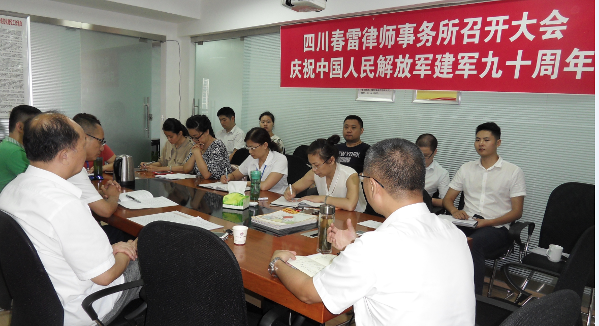 牢固树立崇军尚武民族情结敬畏国防事业 尊重军人地位的社会风尚共筑强军梦实现 春雷律师事务所在2017年7月26日召开党员律师全员大会,庆祝中国人民解放军九十周年,会议由党支部书记顾仕义主持,支部委员吕安全代表党支部就中国人民解放军建军九十周年讲了三个问题。一是中国人民解放军建军节的由来。二是回顾了中国人民解放军近百年历史功绩:(一)是八一南昌起义;(二)是秋收起义;(三)是井冈山会师;(四)是九一八事变;(五)是长征;(六)是遵义会议;(七)是抗日战争;(八)是解放战争;(九)是中国人民解放军的发展。三是八一精神的历史地位:八一精神是中国化马克思主义的重要成果,八一精神是人民解放军的建军之魂;八一精神是中国共产党革命精神的重要坐标;中国共产党创造和培育的红传精神,八一精神、井冈山精神、苏区精神、长征精神、延安精神、西柏坡精神等一脉相承,八一精神是其中的光辉一环。