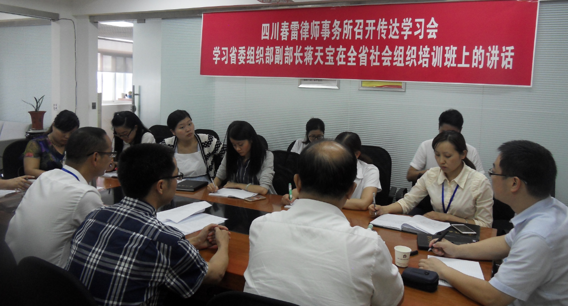 春雷律师事务所党支部举行学习会 学习蒋天宝同志讲话传达示范培训班的概况 2017年9月 1日,春雷所党支部举行学习会,由参加全省“两新”组织书记和党务工作者示范培训学习的吕安全同志,组织到会党员律师认真学习了省委组织部蒋天宝副部长于2017年8月22日在全省两新组织党组织书记和专职党务工作示范培训班开班仪式上的讲话全文。蒋天宝副部长的讲话:一是强化党的意识,切实增强做好两新组织党建工作的责任感和紧迫感;二是强全局观念,准确把握加强两新组织党建工作的重点任务;三是强化责任担当,精准对标中央省委要求当好党组织带头人。