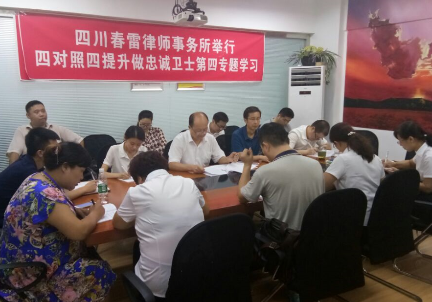自开展四对照四提升做忠诚卫士专题教育以来,四川春雷律师事务所把提高认识加强全体党员律师思想政治教育放在第一位。从提高政治站位,打牢思想基础为重点,教育引导党员律师做到在思想和行动上同以习近平为核心的党中央保持高度一致,做到思想上认同核心,政治上坚信和拥护核心,行动上紧跟核心,以党的旗帜为旗帜,拥护中国特色社会主义制度的先进性。