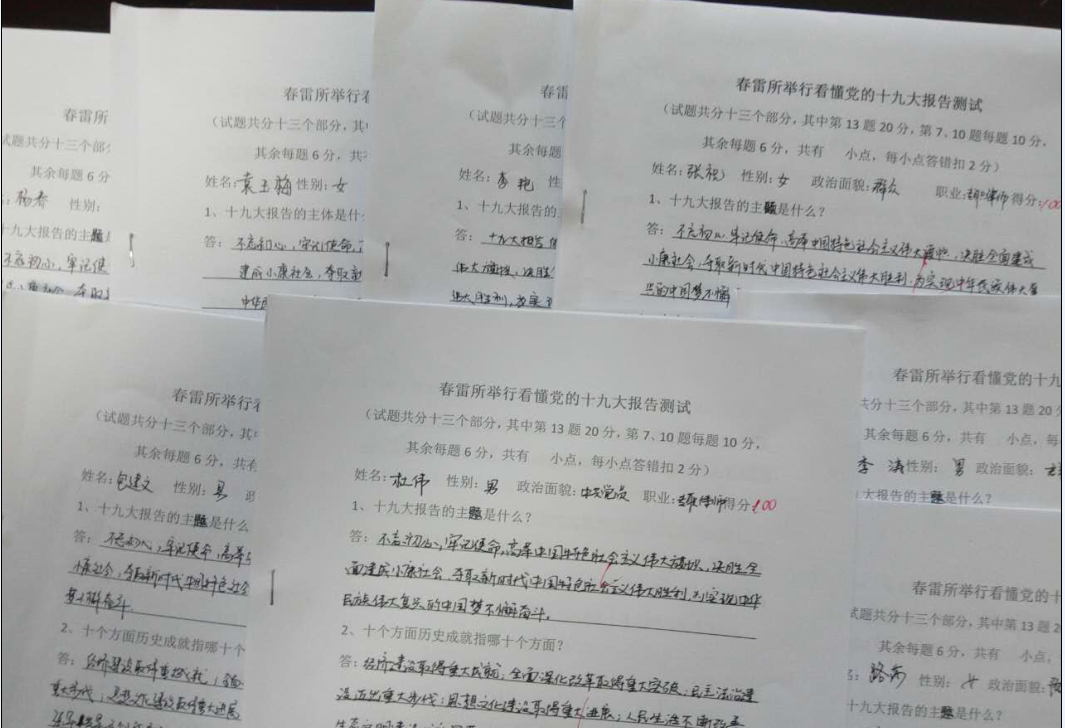四川春雷律师事务所举行 看懂十九大报告初学测试 2017年10月18日,中国共产党第十九次全国代表大会召开以来,春雷律师事务所采取多种形式收看大会盛况和中央领导同志在各代表团会上的重要讲话精神及相关报道后,初步明确了大会主题,提高了思想认识。认为十九大报告指明了党和国家事业前进的方向,是在新时代坚持和发展中国特色社会主义的政治宣言和行动纲领。我们要认真学习,深刻领会中国特色社会主义新时代新论断,深刻领会主要发生矛盾变化的新特点和两步走的新目标,深刻领会党的建设新要求,开拓进取,把新时代中国特色社会主义推向前进。