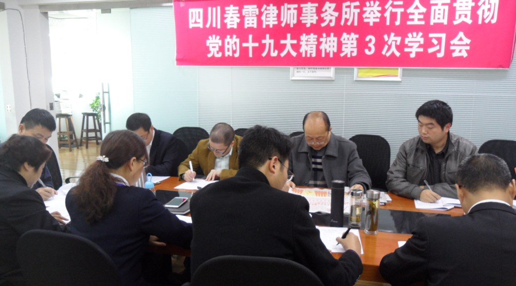 坚决拥护十九大通过的各项决议 坚持党对律师工作的绝对领导 在认真组织收看收听中国共产党第十九次全国代表闭幕大会和新一届中央领导和记者见面会的相关报道后,在2017年10月25日下午春雷律师事务所进行了全面贯彻党的十九大精神第三次学习会。首先学习了大会公报和三个决议。二是学习了“夺取新时代中国特色社会主义伟大胜利”的人民日报理论。三是学习了肩负历史重任,开创复兴伟业的新一届中央委员会和纪律检查委员会诞生等。 在学习上述内容后,进行了讨论。大家一致认为习近平同志再次当选党的总书记是众望所归,是全党全国各族人民的福气。我们要坚决拥护以习近平为核心的党中央的绝对领导,紧密团结在党中央周围。全面贯彻十九大的各项决议精神,在习近平同志的新时代中国特色社会主义思想指导下,努力做好法律服务工作。