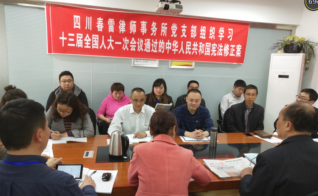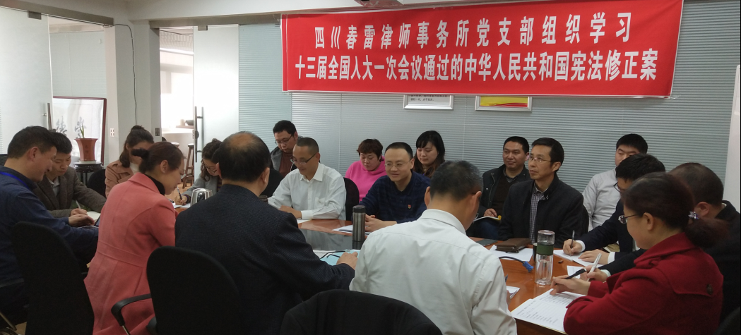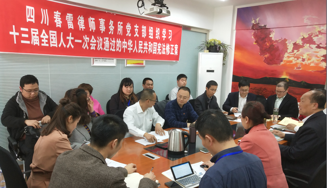 2018年3月14日下午,四川春雷律师事务所党支部组织全体党员、律师工作人员学习十三届全国人大一次会议第三次全体会议精神。在逐字精读全国人大新通过的《中华人民共和国宪法修正案》后,进行了认真讨论。 在讨论中,大家一致表示:“坚决拥护、完全赞成十三届全国人大一次会议高票通过《中华人民共和国宪法修正案》,这一表决结果充分说明,宪法修正案顺应了党和人民事业发展要求,体现了党的主张和人民意志的高度统一,反映了全党全军全国各族人民的共同愿望和心声。”