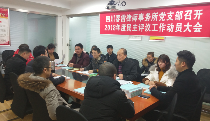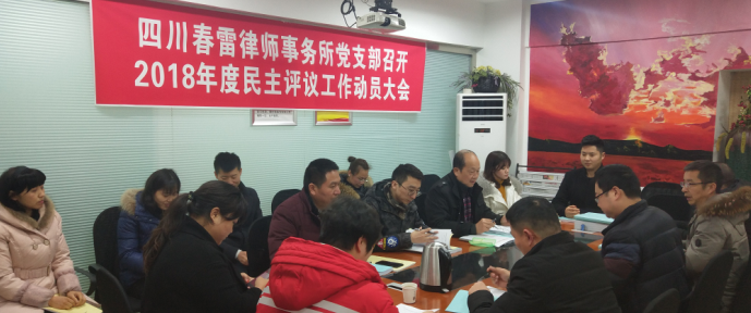 认真学习统思想 精心筹划细部署 ——四川春雷律师事务所党支部召开2018年民主评议动员会 2018年元月10日下午,四川春雷律师事务所党支部召开扩大会,对开展2018年组织生活会和民主评议党员活动进行安排部署,会议由支部组织委员吕安全同志主持,全所除党员律师外共计17人参会。