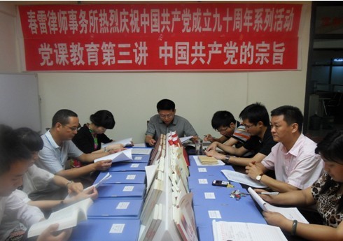 ![]() 中共春雷律师事务所党支部按照本所《关于隆重庆祝中国共产党成立90周年活动安排》(中共四川绵阳春雷律师事务所支部委员会春律发[2011]07号文件)的安排,于2011年5月6日在本所会议室,由事务所支部副书记黄法森同志为本所全体律师、工作人员上了一堂题为“党的宗旨”的党课。